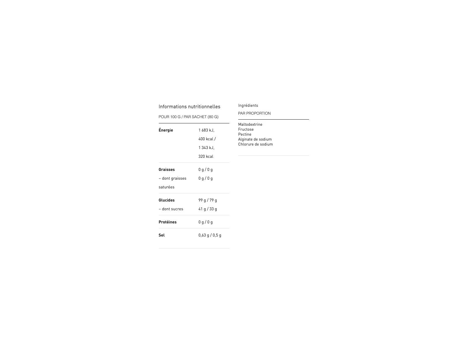 La boisson pour sportifs la plus riche en glucides au monde. Utilisée par les meilleur(e)s coureurs et coureuses au monde. Un sachet (500 ml) contient 80 grammes de glucides. Formule enrichie en caféine permettant de gagner en lucidité et en énergie explosive pour une fin de course.